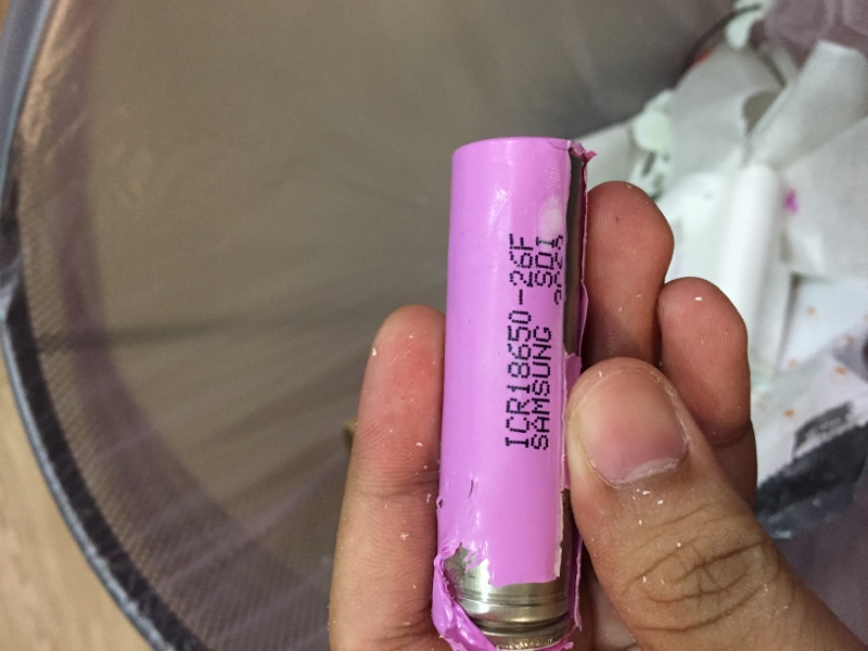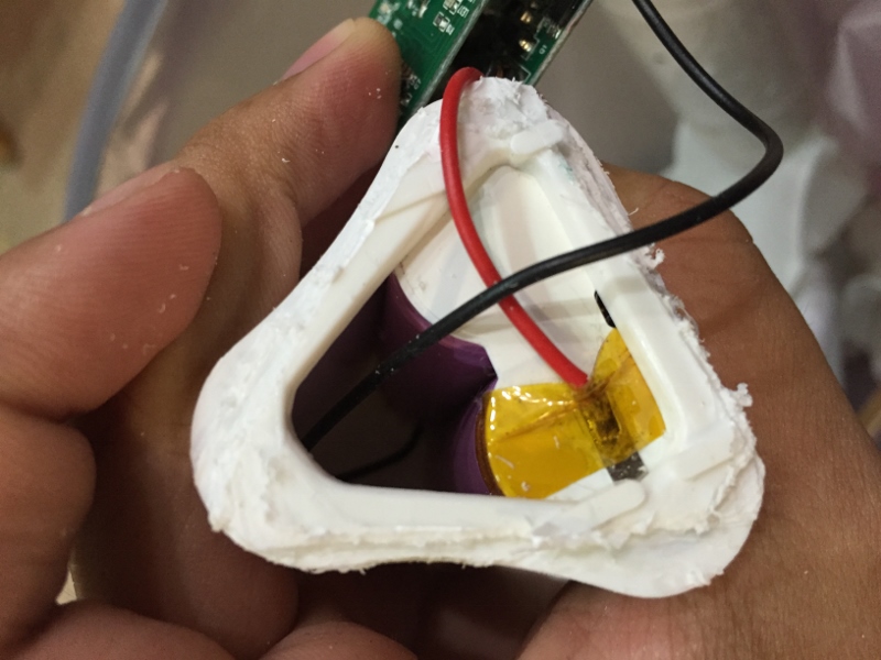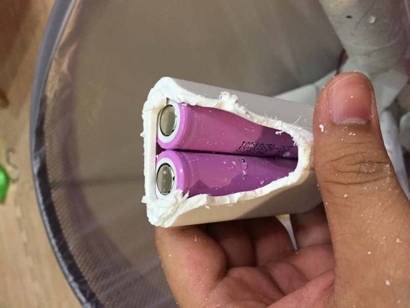 後來又花了將近20分鐘,把電池那端的殼割了一角出來...看到兩顆18650電池了,通常一顆是2600Mah,所以兩顆就是5000,因為它黏的很死,拔來塑膠皮都掉了