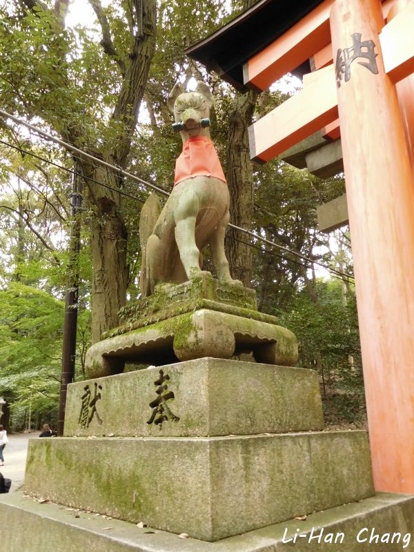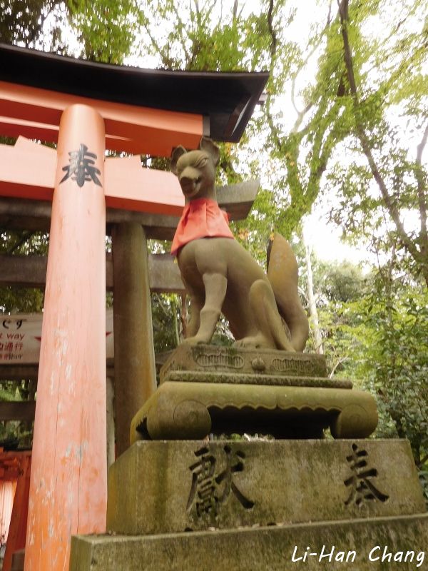 然後就看到一堆鳥居了,我一開始以為千本鳥居就這些,好像沒有「千」的感覺,走一段路就看到此處的神明,左右各一隻