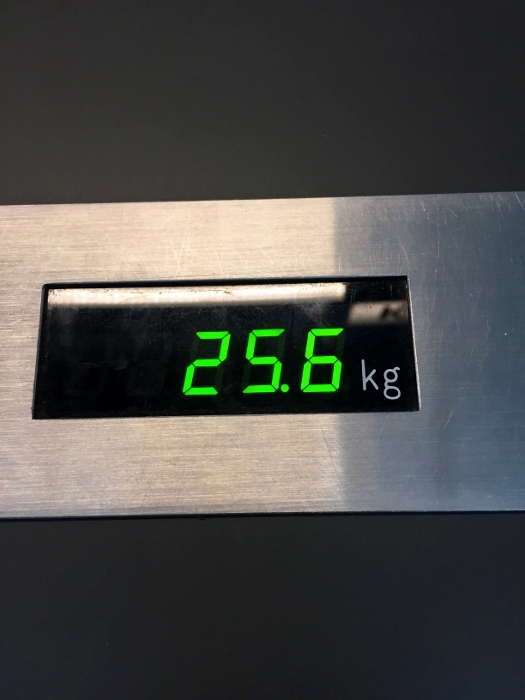 抵達機場,因為我們提早很多時間到,所以先去空蕩蕩的櫃台問一下,行李限重是不是有增加,順便秤一下 25.6KG,如果長榮沒有把限重提高,我就過重了XD