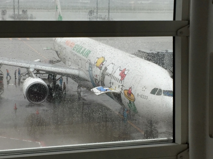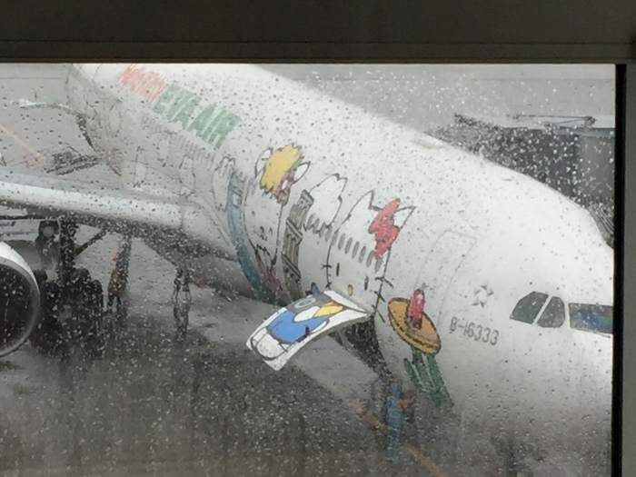 買完伴手禮之後,就到候機室等,看到Hello kitty的飛機了,雖然是大雨還是看的出來很特別