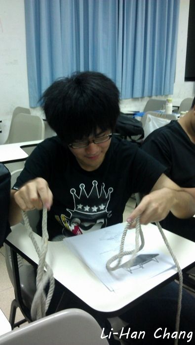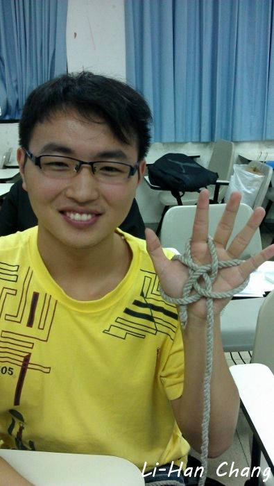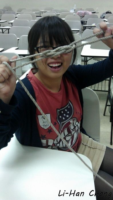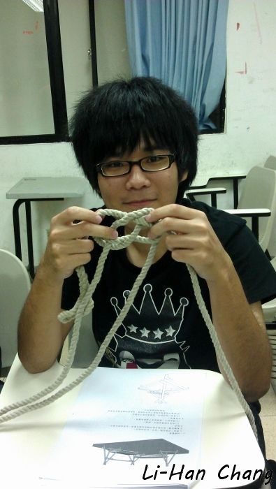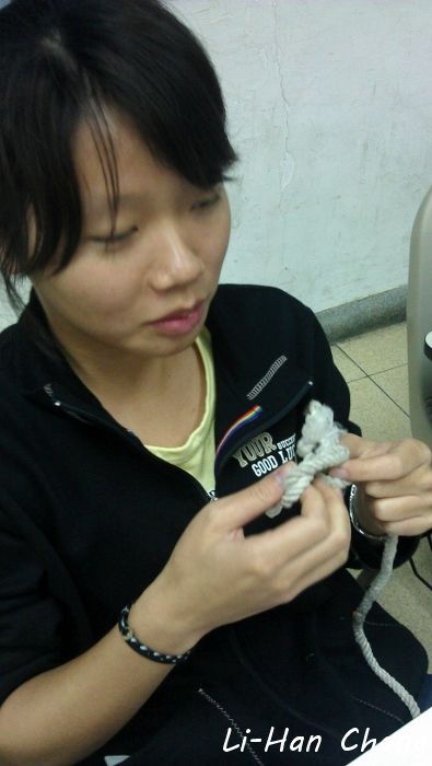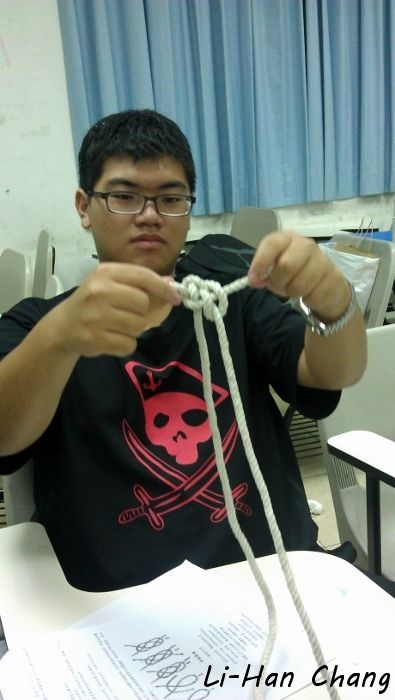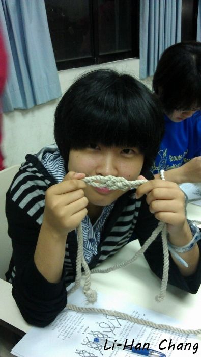 這一年作法是將所有繩結拆散,不要集中成一個考科,如此一來可以分散大家的考核壓力,所以授課的最後都會教一兩個有關係的繩結,下面是大家成功打出「花蓮結」了~