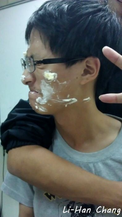 立泰很溫馨的把蛋糕拿到眼前,吹蠟燭~吹完就架住壽星!抹奶油~